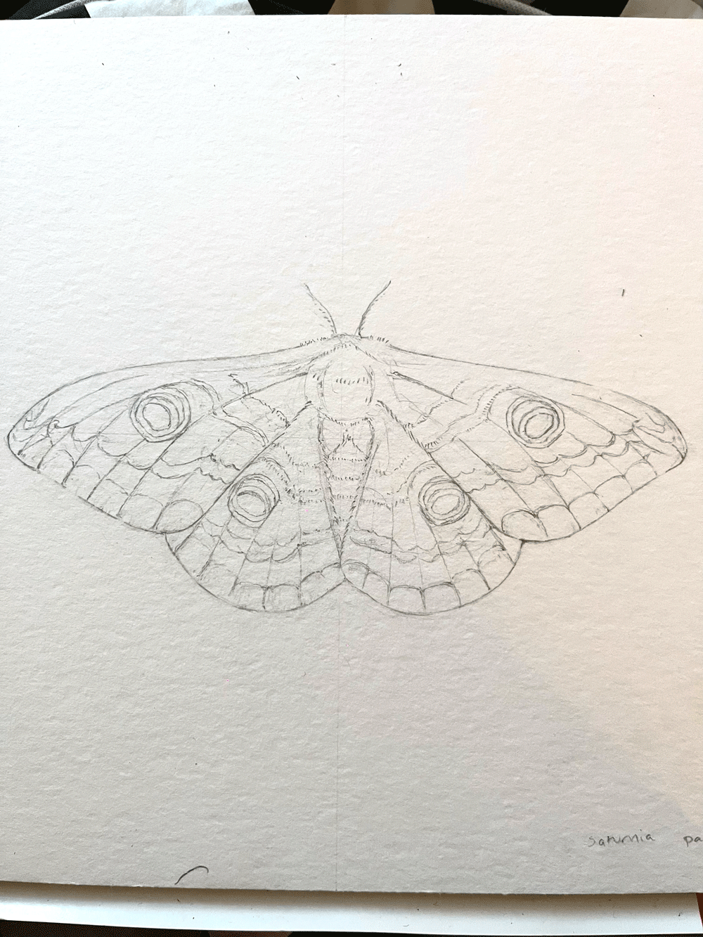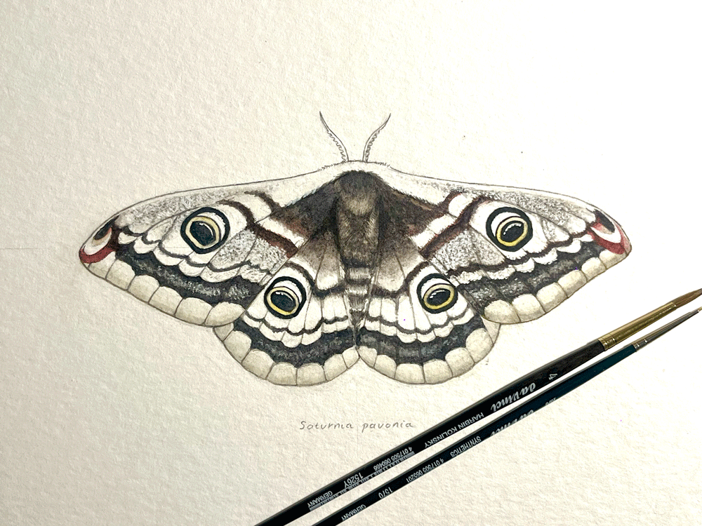 Watercolor of a small emperor moth, after I found a live specimen outside. 2025.