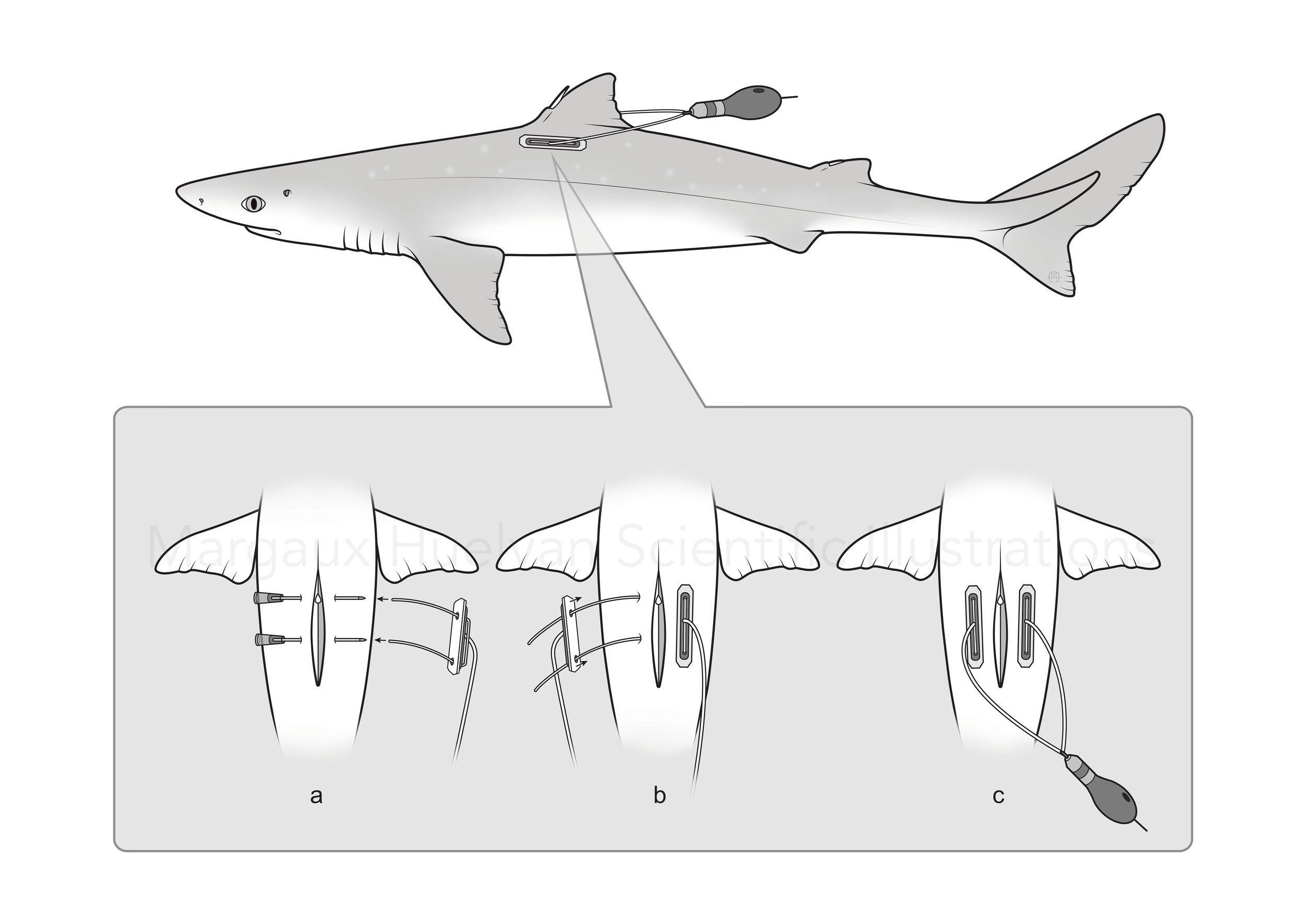 This step-by-step procedure illustration shows the attachment of a tracking tag on the spurdog. Created in collaboration for the Havforskningsinstituttet. Adobe Illustrator. 2023